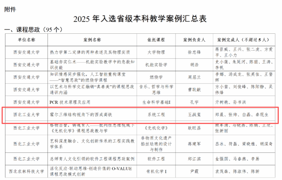 近日,陕西省教育厅公布了2025年省级本科教学案例遴选结果,新葡的京官网王战玺教授团队依托《系统工程》课程的教学案例-《霍尔三维结构视角下的西成高铁》、王文东教授团队的教学案例-《基于电工学课程的“六位一体”课赛融合教学新模式探索与实践》成功入选省级本科教学案例。