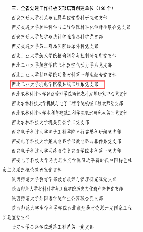 近日,中共陕西省委教育工作委员会发布《关于公布第五批陕西高校党建工作示范高校、标杆院系及样板支部培育创建单位名单的通知》,新葡的京集团8814微系统工程系党支部成功获批成为“全省党建工作样板支部”培育创建单位。