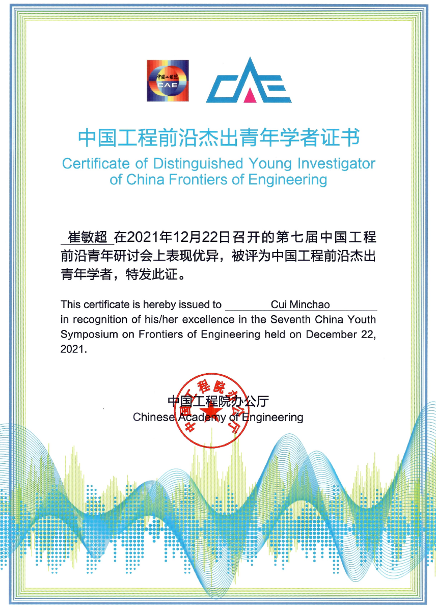 2022年7月19日-21日,“第七届中美工程前沿研讨会(简称CAFOE)”以视频会议方式在北京和美国加州尔湾举行。新葡的京集团8814青年教师崔敏超受邀参加研讨会并荣获由中国工程院颁发的“中国工程前沿杰出青年学者”荣誉证书。