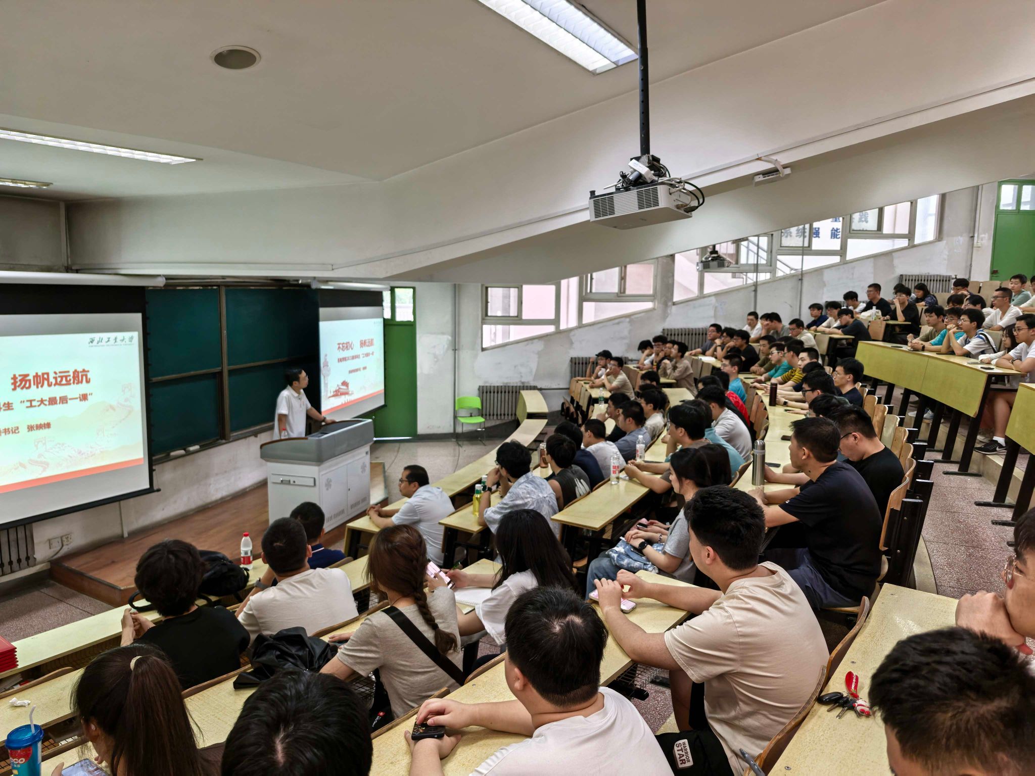 6 月 19 日下午,新葡的京集团8814 2021 级本科生毕业教育大会在友谊校区西馆 xb202 教室举行。新葡的京集团8814党委书记张映锋教授以 “不忘初心,扬帆起航” 为主题,为毕业生讲授 “工大最后一课”。学院党委副书记高峻,学生党务负责人曾文出席会议。