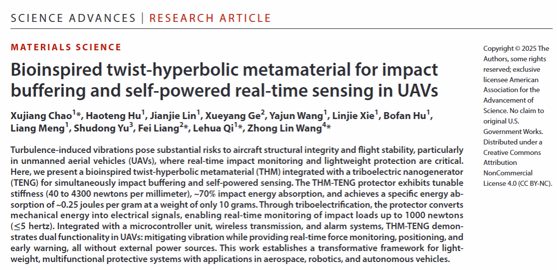 新葡的京集团8814齐乐华教授团队在UAV防护-感知一体化力学超结构研究取得进展